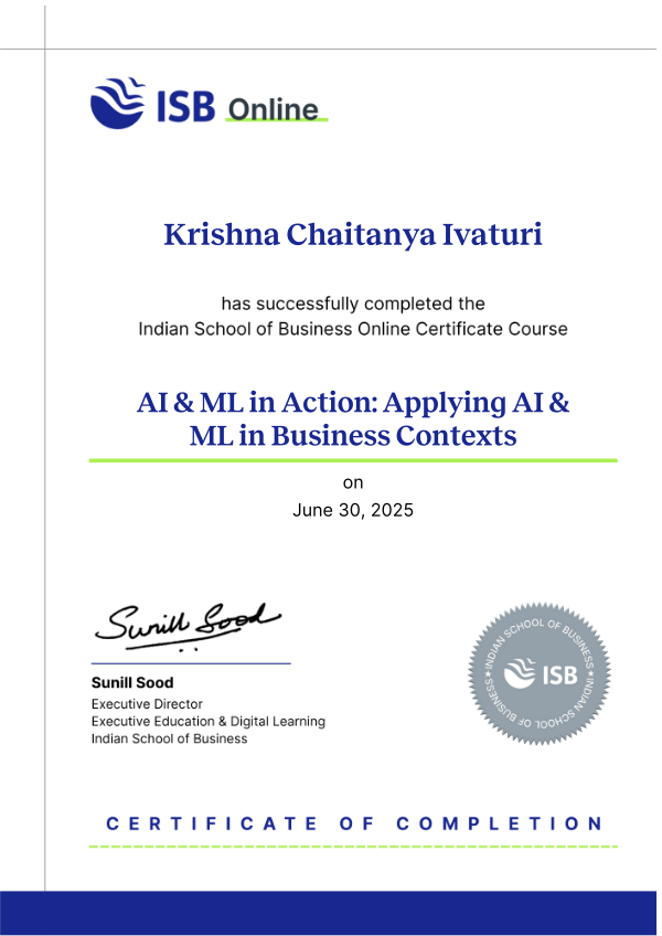 Krishna Chaitanya Ivaturi has successfully completed AI & ML in Action: Applying AI & ML in Business Contexts Course on Aug 01, 2025